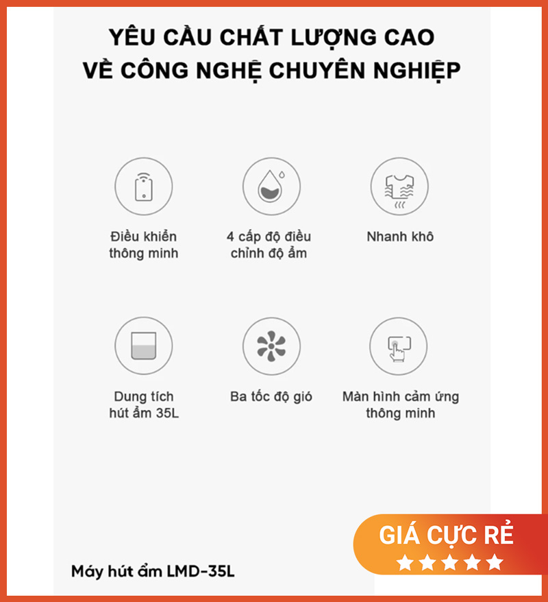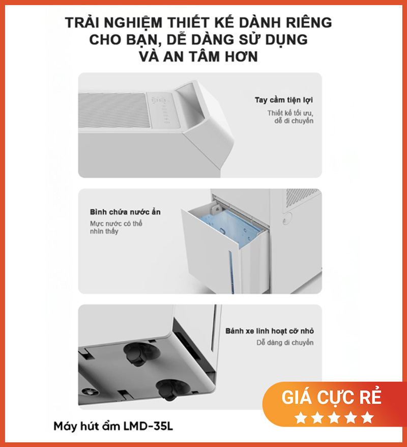 Sản phẩm nổi bật nhờ công suất hút ẩm 35L/ngày, bình 5.5L, hỗ trợ xả nước liên tục, màng lọc không khí và điều khiển qua điện thoại—phù hợp cho gia đình và văn phòng tại Việt Nam, nhất là mùa nồm ẩm.