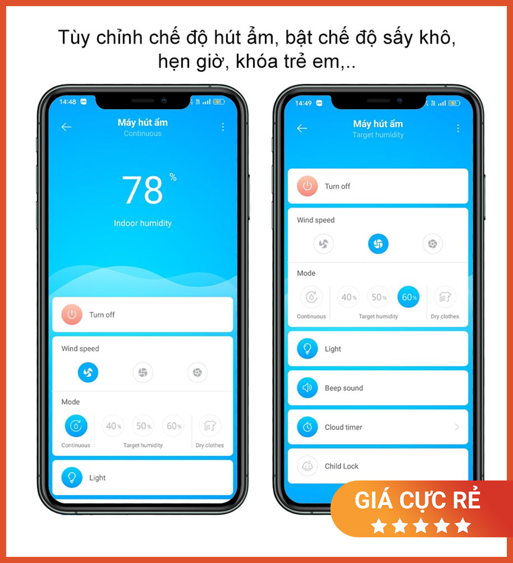 Điều khiển qua App: bật/tắt từ xa, thay đổi chế độ nhanh theo nhu cầu.