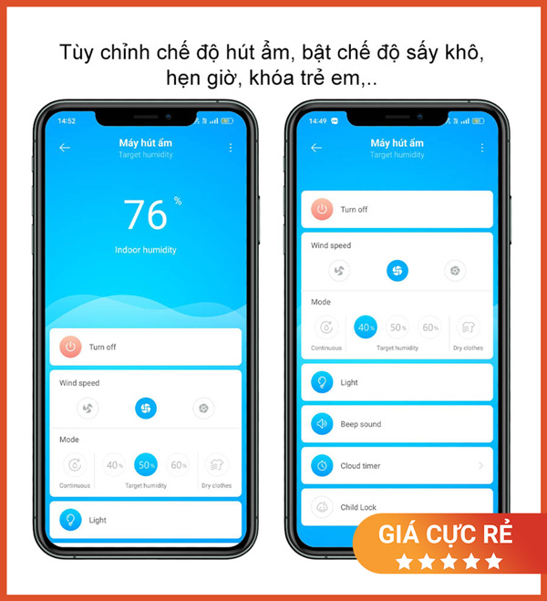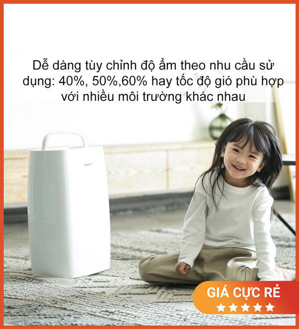Tùy chỉnh độ ẩm mục tiêu: Người dùng có thể chọn mức độ ẩm mong muốn từ 40% đến 70% tùy theo điều kiện thời tiết và nhu cầu sử dụng.