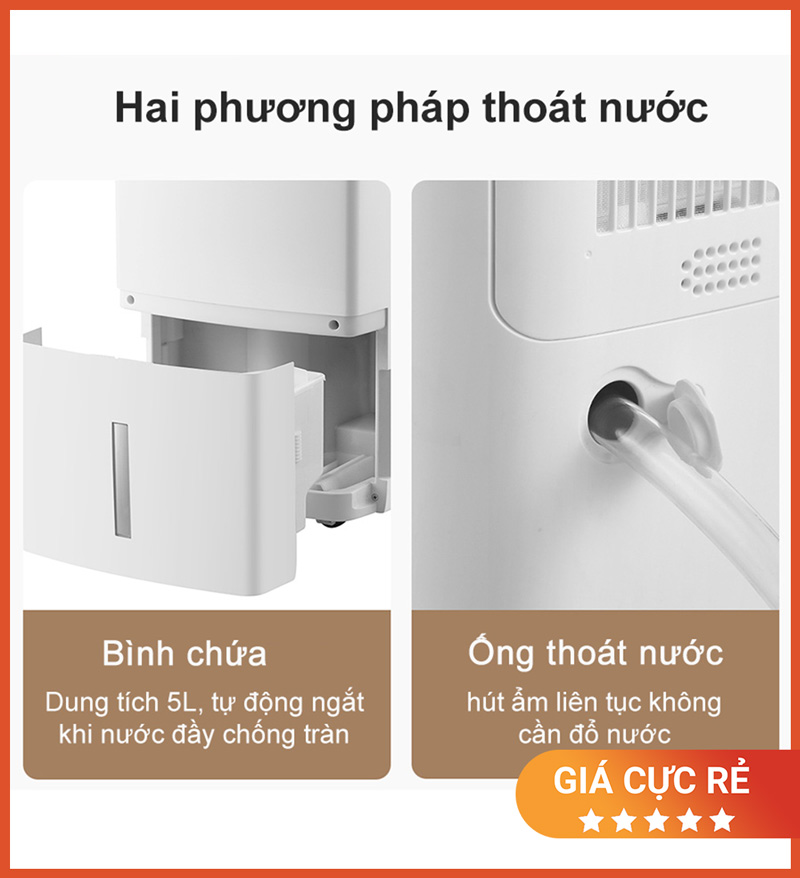 Thoát nước bằng bình chứa 5L: dung tích lớn giúp máy chạy lâu hơn, ít phải đổ nước trong ngày nồm ẩm.
