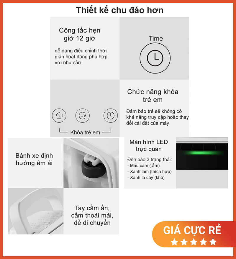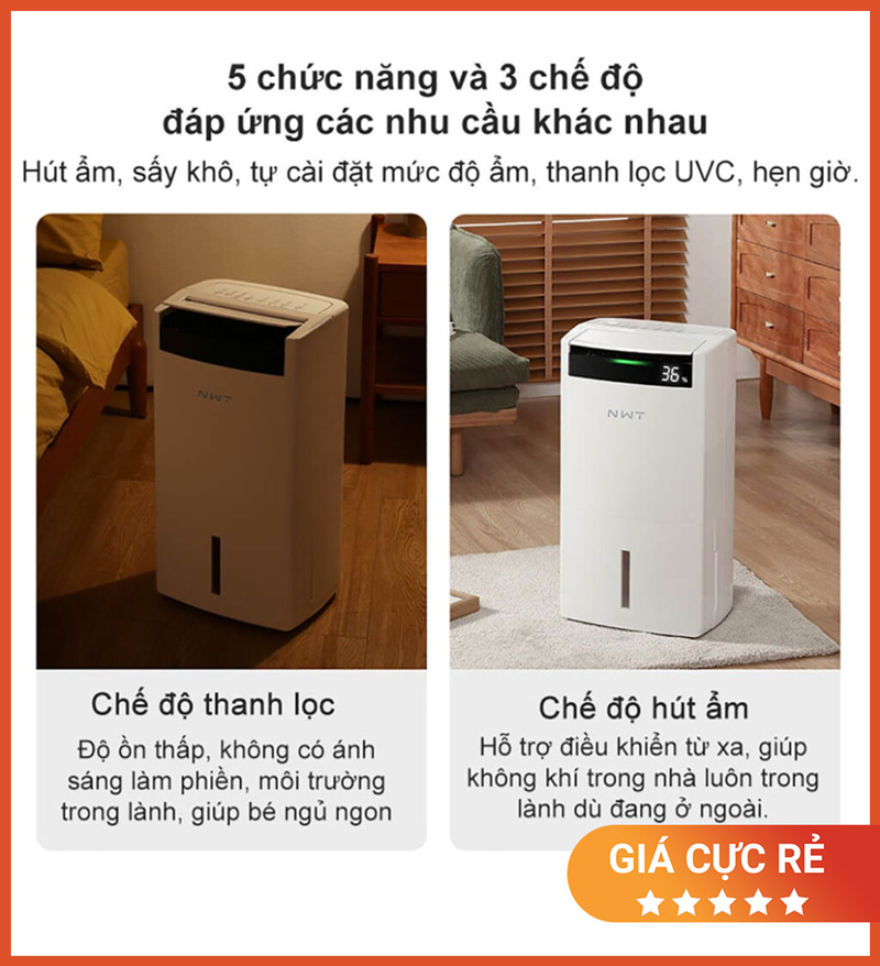 5 chức năng giúp bạn chọn đúng nhu cầu: hút ẩm nhanh khi trời nồm, duy trì độ ẩm ổn định cho phòng sinh hoạt, hỗ trợ hong/sấy đồ khi phơi trong nhà…