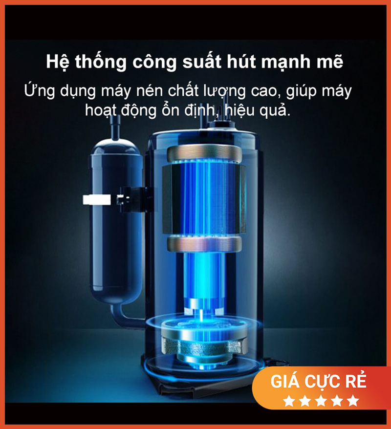 Máy nén tự động giúp thiết bị vận hành ổn định và tối ưu theo độ ẩm trong phòng. Khi độ ẩm cao, máy tăng hiệu suất để kéo ẩm nhanh; khi đã đạt mức cài đặt, máy tự điều chỉnh để duy trì, tránh chạy quá mức.