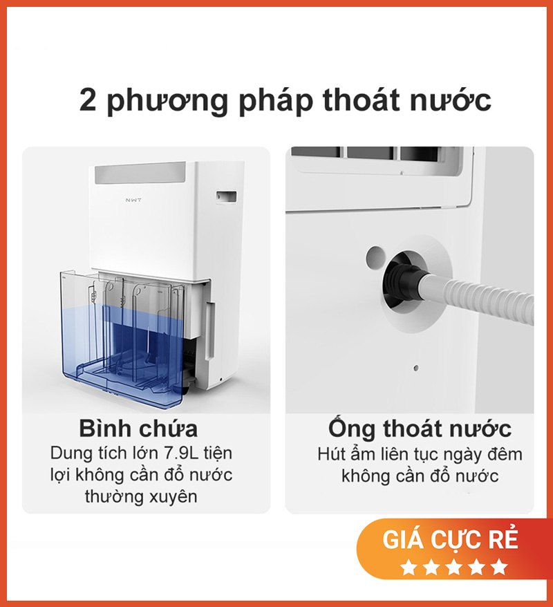 Máy công suất lớn tạo nhiều nước ngưng tụ, nên thiết kế được tối ưu để bạn dùng “nhàn” với bình chứa dung tích lớn và thoát nước liên tục tích hợp (kèm ống 5m) để linh hoạt theo từng nhu cầu: