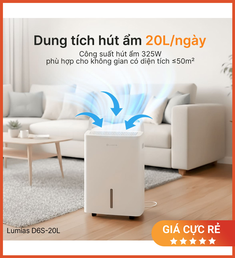 Lumias D6S-20L có khả năng hút ẩm tối đa 20L/ngày (điều kiện 30°C/80%RH), đáp ứng tốt không gian ≤ 50m² như phòng khách, phòng ngủ lớn, căn hộ 1–2 phòng ngủ hoặc phòng làm việc.