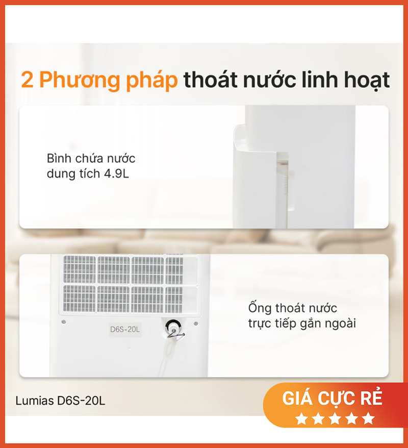 Lumias D6S-20L có bình chứa nước 4.9L giúp máy chạy lâu hơn, giảm tần suất đổ nước trong những ngày độ ẩm cao.