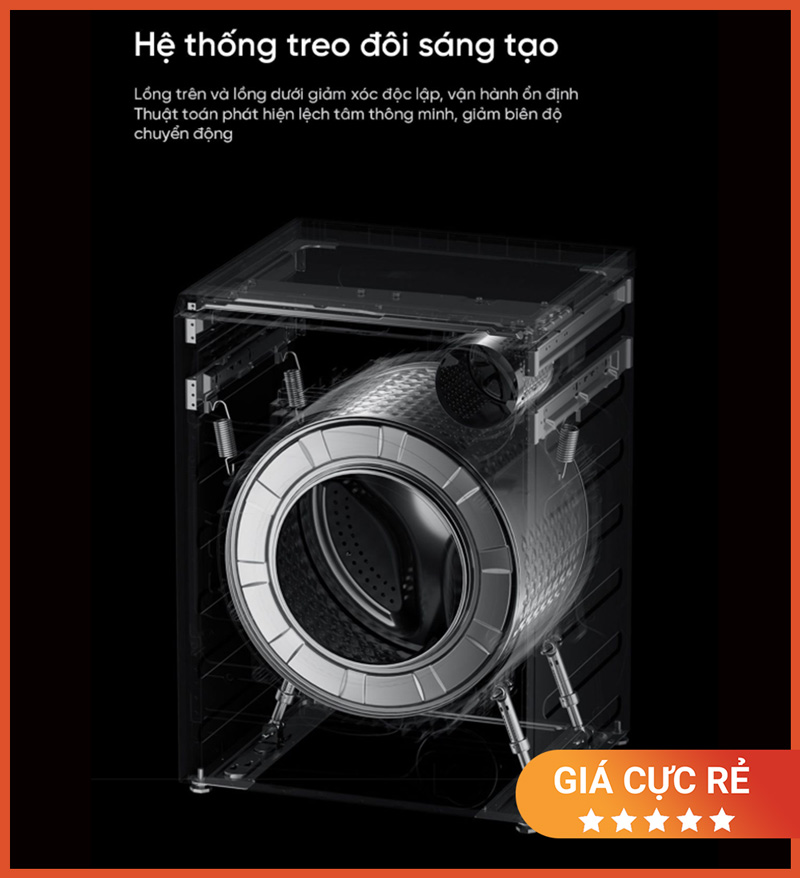 Máy giặt sấy Xiaomi Mijia MJ107 được trang bị hệ thống treo đôi độc lập cho từng lồng giặt, một thiết kế hiếm thấy trong phân khúc máy giặt sấy gia đình. Cấu trúc này giúp: