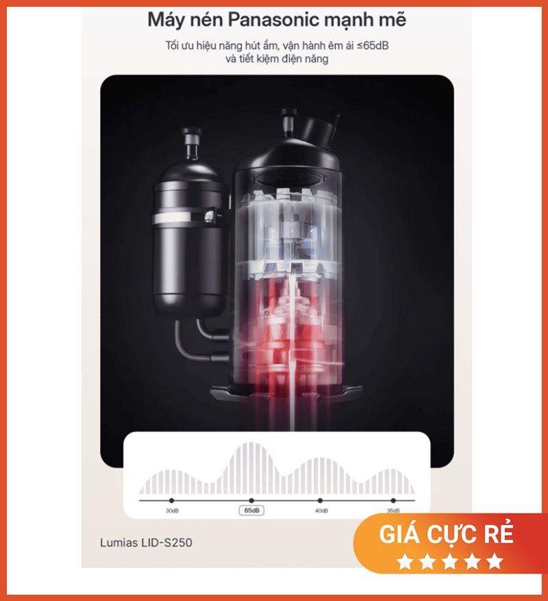 Lumias LID-S250 trang bị máy nén Panasonic giúp máy hoạt động ổn định khi vận hành liên tục, đồng thời tối ưu hiệu suất sử dụng điện theo nhu cầu thực tế.