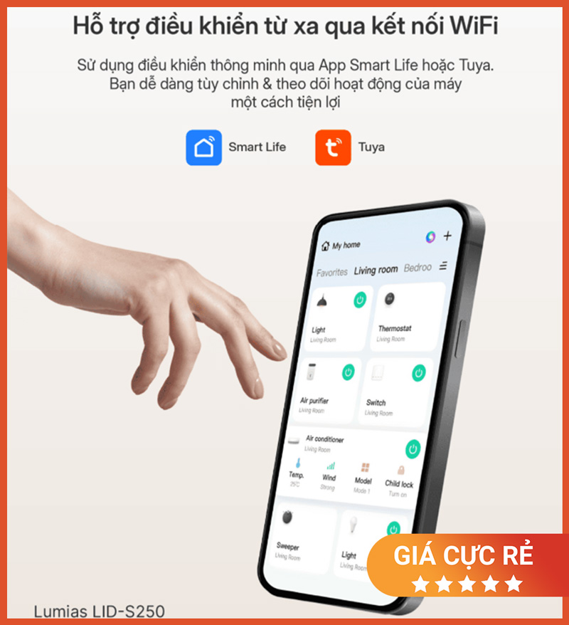 Lumias LID-S250 hỗ trợ điều khiển từ xa qua WiFi, giúp bạn quản lý máy hút ẩm ngay trên điện thoại thông qua ứng dụng Smart Life / Tuya. Tính năng này đặc biệt hữu ích với kho/xưởng rộng 350–450m² hoặc khi bạn cần giám sát độ ẩm mà không phải có mặt trực tiếp.