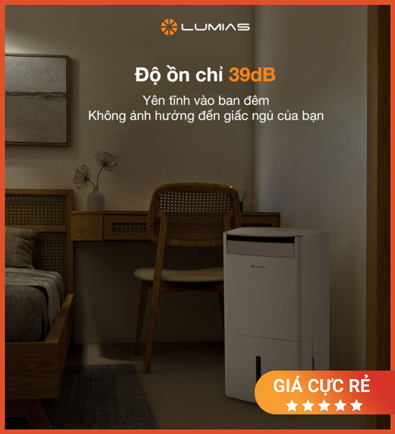 Một trong những băn khoăn lớn khi dùng máy hút ẩm là tiếng ồn, đặc biệt nếu bạn đặt máy trong phòng ngủ hoặc phòng làm việc. Lumias D6S-26L có độ ồn thấp chỉ 39dB, giúp máy hoạt động êm, hạn chế gây khó chịu khi sử dụng lâu.