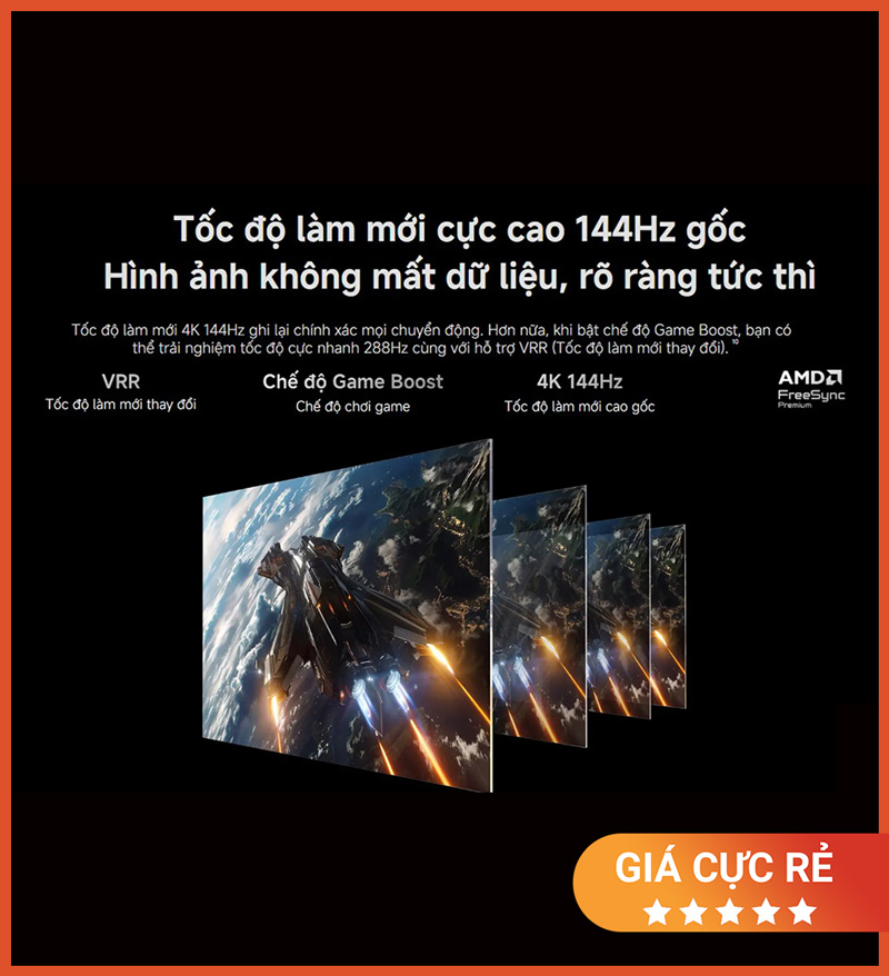 Một trong những yếu tố nâng tầm trải nghiệm giải trí trên mẫu TV này chính là tần số quét 144Hz. Đây là thông số rất quan trọng giúp màn hình hiển thị chuyển động mượt mà hơn, đặc biệt trong các cảnh thể thao, phim hành động, đua xe hoặc game tốc độ cao.