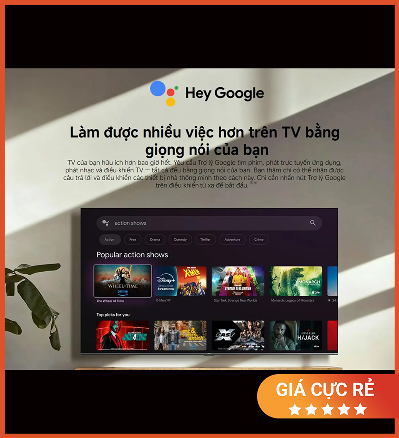 TV còn được tích hợp Google Assistant, cho phép điều khiển bằng giọng nói nhanh chóng và tiện lợi hơn. Người dùng có thể tìm kiếm nội dung, mở ứng dụng, thay đổi chương trình hoặc thực hiện các thao tác cơ bản mà không cần phụ thuộc hoàn toàn vào remote.