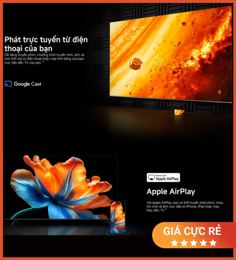 Mẫu TV này hỗ trợ cả Google Cast và Apple AirPlay, mang đến khả năng phản chiếu và chia sẻ nội dung đa nền tảng. Người dùng có thể dễ dàng truyền video, hình ảnh hoặc nội dung từ điện thoại, máy tính bảng và laptop lên màn hình lớn 98 inch.