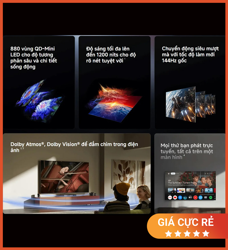Không chỉ gây ấn tượng bởi kích thước, mẫu TV này còn sở hữu nhiều điểm mạnh nổi bật như 880 vùng dimming, độ sáng tối đa 1200 nits, hiển thị 1,07 tỷ màu, hỗ trợ Dolby Vision®, HDR10+, Freesync Premium, Dolby Atmos®, DTS:X® và hệ điều hành Google TV™. Đây là lựa chọn đáng cân nhắc cho người dùng muốn nâng cấp trải nghiệm xem phim, thể thao và giải trí gia đình lên một tiêu chuẩn cao hơn.