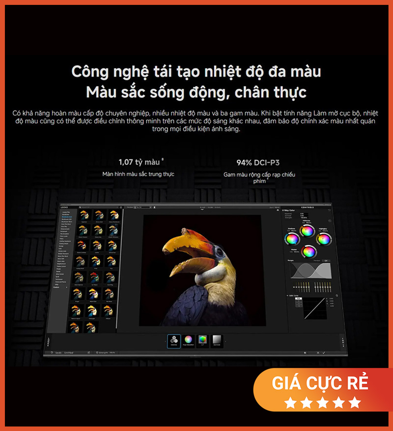 Hiển thị 1,07 tỷ màu, dải màu DCI-P3 94% cho độ chuẩn màu cao
