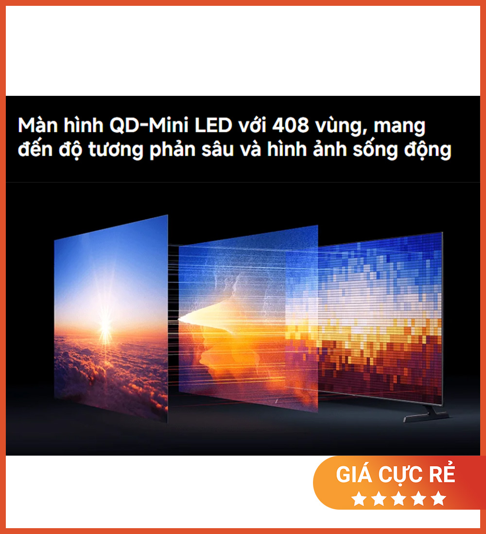 Điểm nhấn của mẫu tivi này chính là màn hình MiniLED 4K với 3840 vùng làm mờ cục bộ, độ sáng cực đại lên tới 1700 nits và lớp phủ chống chói giảm lóa, giúp hiển thị sắc nét ngay cả trong điều kiện ánh sáng mạnh. Bên cạnh đó, tần số quét 144Hz cùng AMD FreeSync mang đến chuyển động mượt mà, lý tưởng cho cả xem phim hành động lẫn chơi game tốc độ cao.