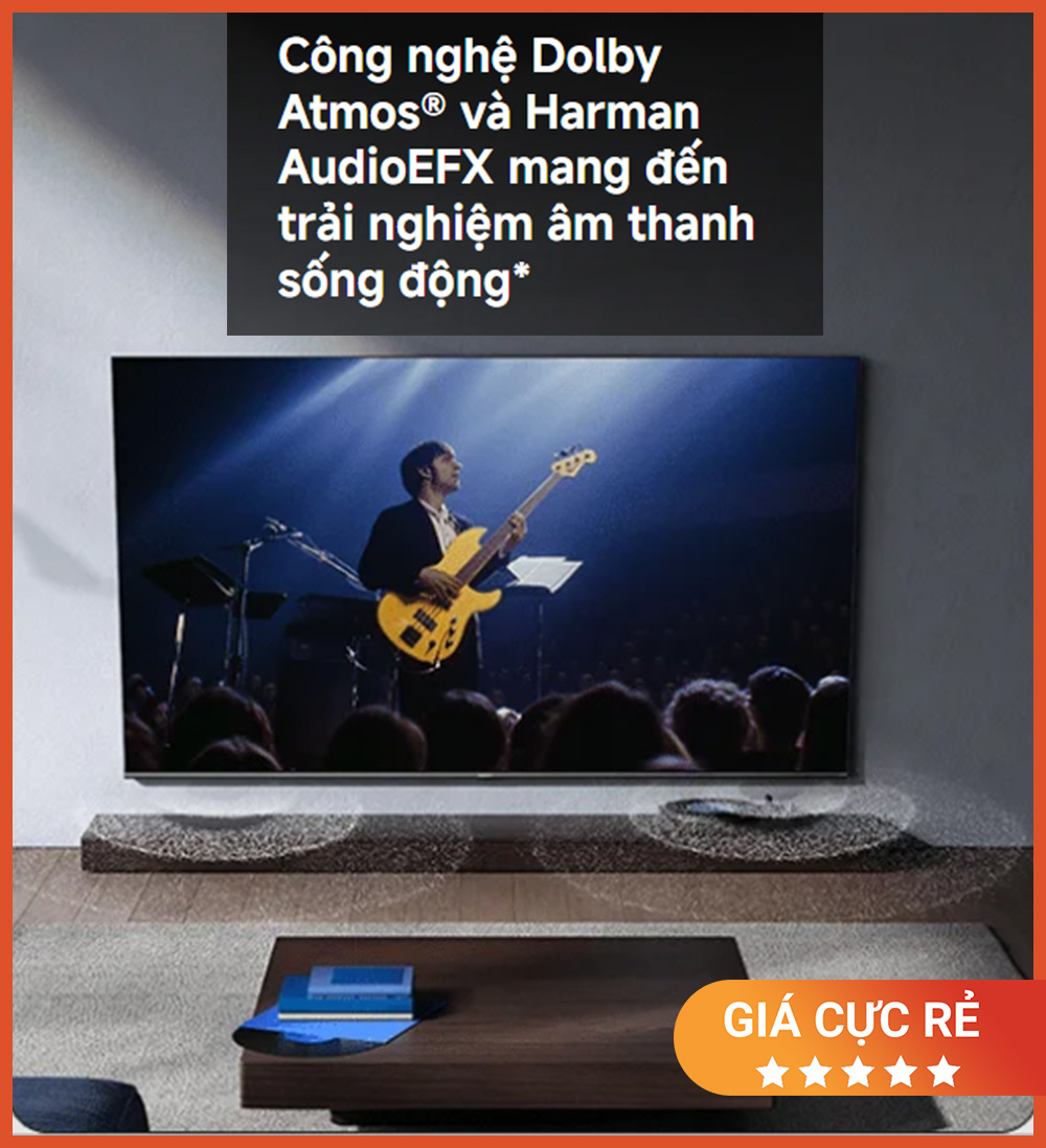 Trang bị hệ thống 2 loa 15W cùng công nghệ Dolby Atmos, Dolby Audio và DTS-X, tivi mang đến âm thanh đa chiều, bao trùm không gian. Người dùng sẽ cảm nhận rõ ràng từng lời thoại, âm nhạc và hiệu ứng hành động, nâng tầm trải nghiệm giải trí gia đình.