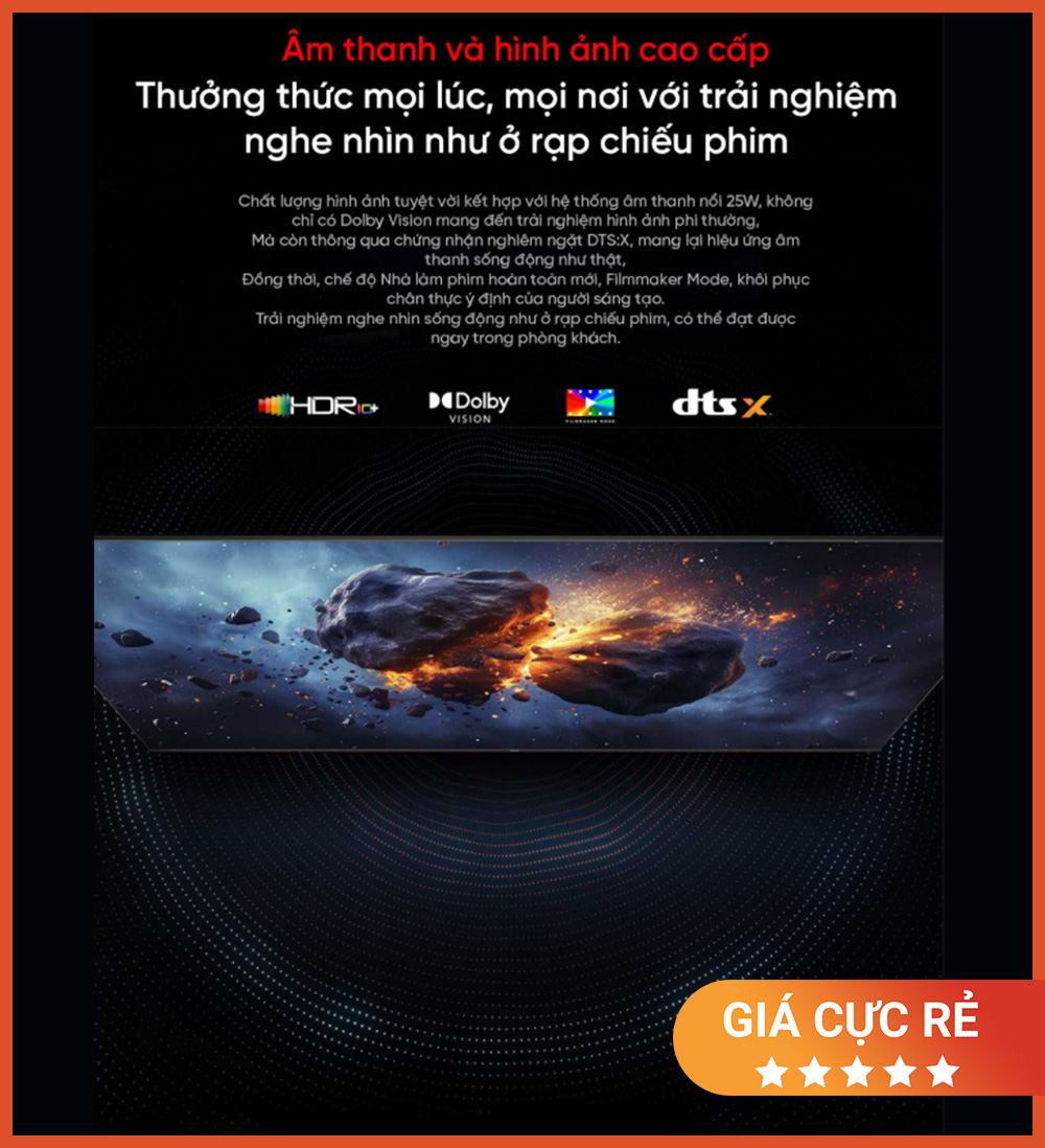 Sự kết hợp giữa Dolby Vision và DTS:X giúp Redmi X65 Inch 2025 mang lại trải nghiệm giải trí đỉnh cao về cả hình ảnh lẫn âm thanh.