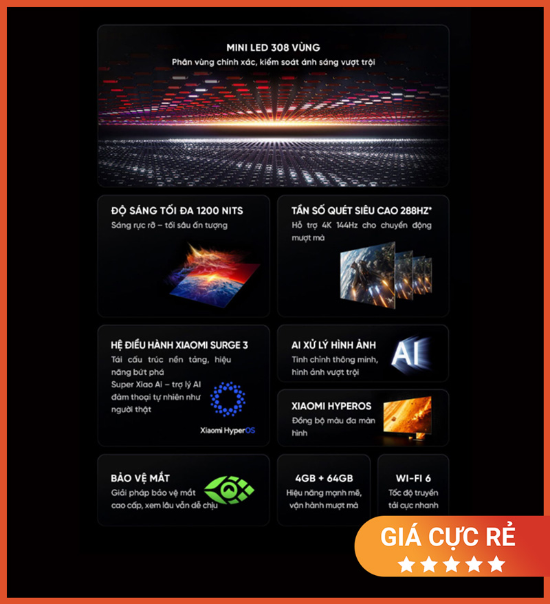 Xiaomi Redmi X75 MiniLED 2026 – Chính Hãng (4/64GB) là lựa chọn “cân mọi nhu cầu” cho phòng khách: MiniLED đa vùng cho đen sâu – sáng mạnh 1200 nits cho HDR nổi khối – màu chuẩn điện ảnh – mượt 288Hz cho thể thao & game – Dolby Vision tối ưu theo cảnh. Thêm Surge OS 3 mượt dễ dùng, Super XiaoAI tiện điều khiển, Art Screensaver tăng chất decor, thiết kế tràn viền sang, đây là mẫu TV 75 inch vừa mạnh trải nghiệm vừa đẹp thẩm mỹ.