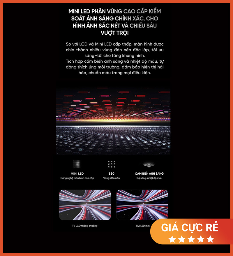 Công nghệ MiniLED đa vùng (Local Dimming) giúp TV điều khiển đèn nền theo từng khu vực nhỏ: