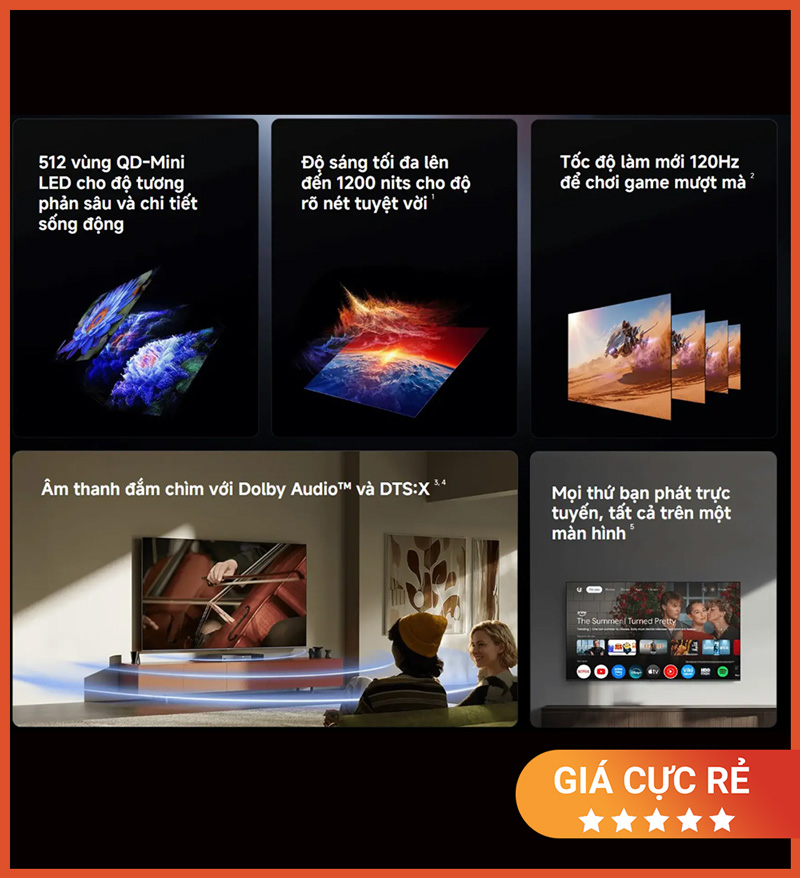 Điểm hấp dẫn của mẫu tivi này nằm ở sự kết hợp giữa công nghệ Mini LED, độ sáng cao, khả năng tái tạo màu sắc giàu chiều sâu và hệ điều hành thông minh dễ sử dụng. Không chỉ phục vụ nhu cầu xem truyền hình thông thường, đây còn là thiết bị phù hợp để xem phim, theo dõi thể thao, chơi game, chia sẻ nội dung từ điện thoại và kết nối với các thiết bị khác trong hệ sinh thái giải trí hiện đại.
