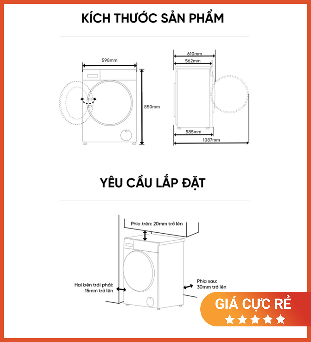 Mặc dù dung tích giặt lớn nhưng máy chỉ rộng 598mm, dễ dàng đặt gọn trong góc phòng giặt, tủ bếp, ban công hoặc phòng tắm nhỏ.